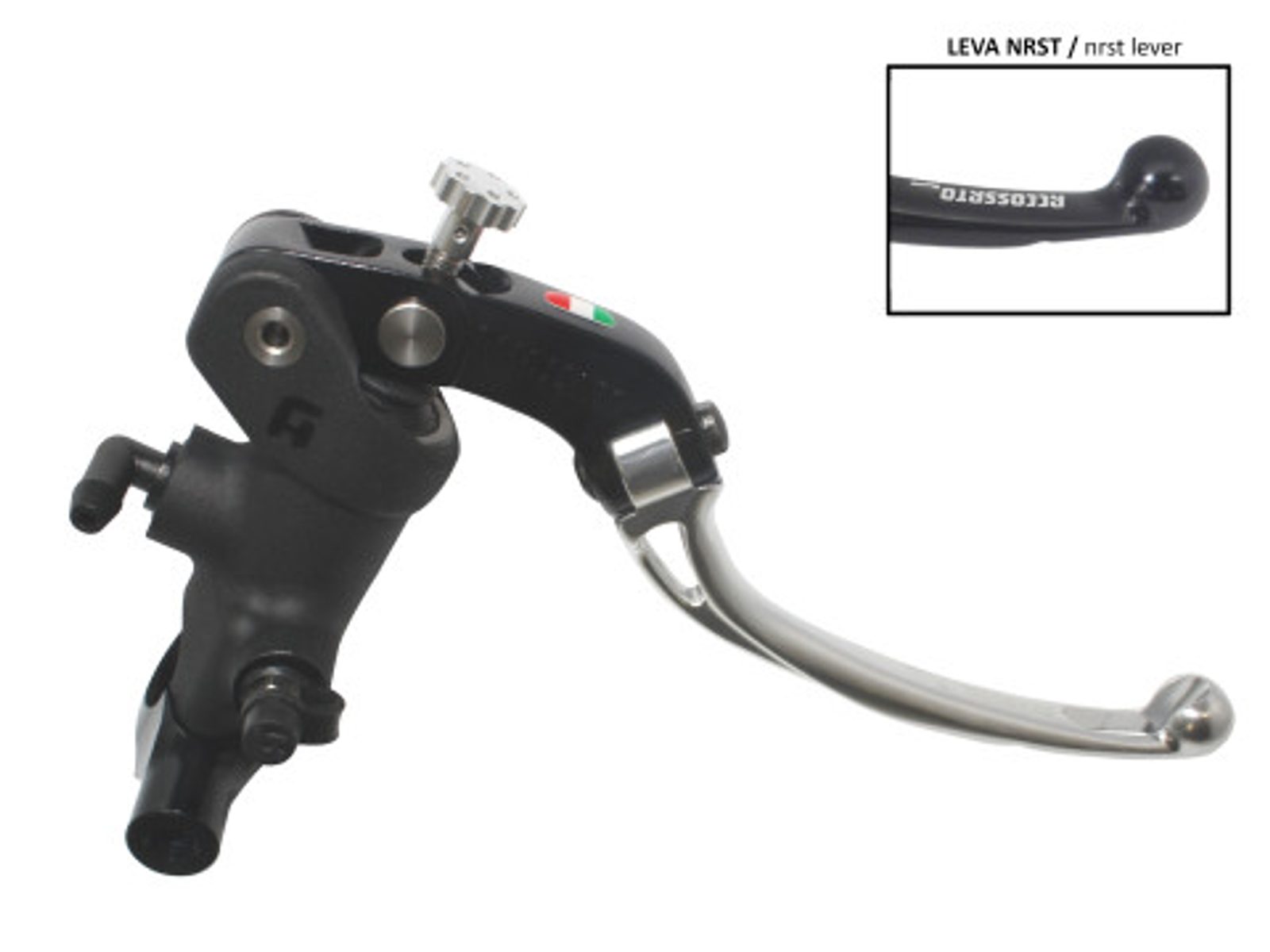 Radial brake master cylinder ACCOSSATO 19 x 18 with integrated fluid reservoir and black folding lever (nut+lever)
