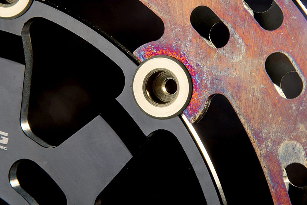 Barva brzdné plochy je výsledkem speciálního tepelného zpracování, které dodává oceli toto charakteristické duhové zbarvení, díky němuž bude váš stroj vynikat mezi ostatními. Chladící otvory nejsou orientovány vertikálně, ale horizontálně a jsou uspořádány ve skupinách po třech v každém směru. Ventilační otvory společně se speciálním tepelným zpracováním zabraňují přehřátí materiálu, které by mohlo vést k deformaci kotouče.