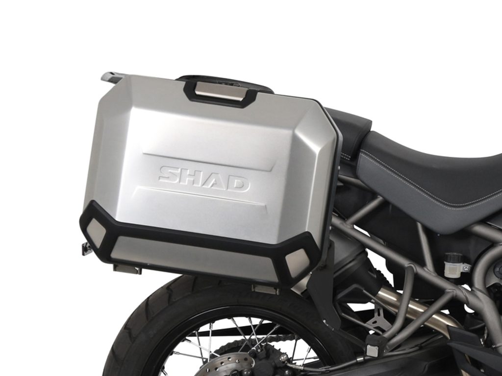 Kompletný sada bočnýcg čiernych hliníkových kufrov SHAD TERRA BLACK, 36/47 l litrov, vrátane montážnej sady a platni SHAD TRIUMPH Tiger 800
