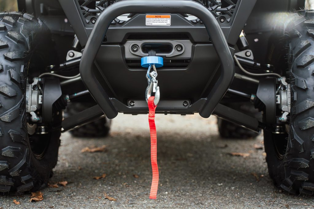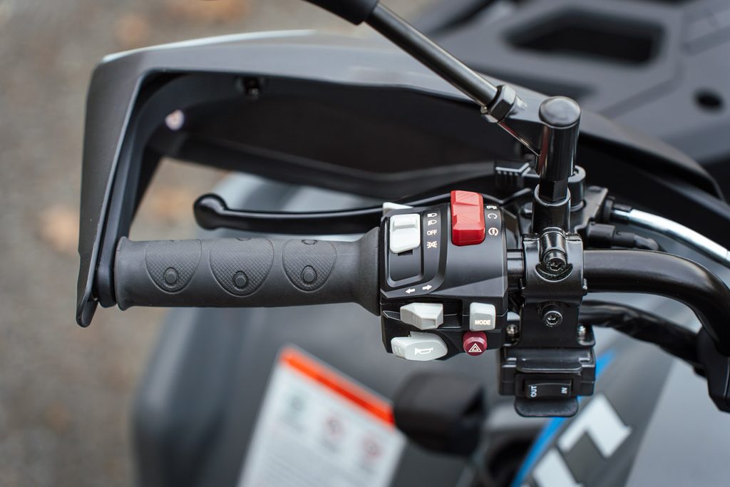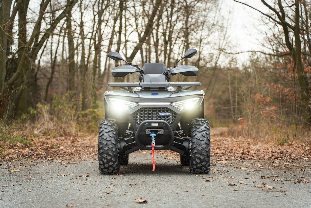 Elektrický navijak 3000lbs s nylonovým lanom, elektrický posilňovač riadenia EPS, homologované ťažné zariadenie, 14" designové ALU kolesá, značkové 26" pneumatiky Bulldog, kompozitové nosiče vpredu a vzadu, kryty páčok a rúk, Full-LED osvetlenie, veľký 7“ TFT displej