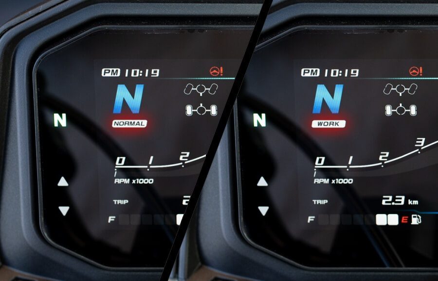 ►NORMAL - režim na bežnú jazdu a ľahšie práce poskytuje úspornú prevádzku a je ideálny na každodenné jazdenie či presuny v menej náročnom teréne.