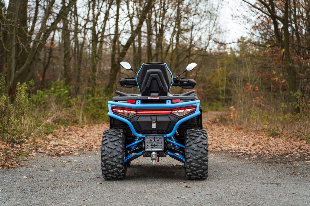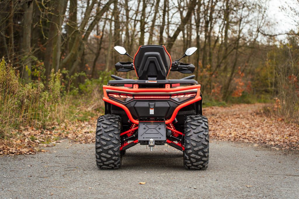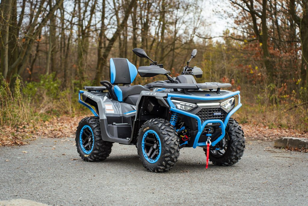 Elektrický navijak 3000lbs s nylonovým lanom, elektrický posilňovač riadenia EPS, plynokapalinové plne nastaviteľné tlmiče s oddelenou nádobkou, homologované ťažné zariadenie, 14" dizajnové ALU kolesá so systémom Beadlock, značkové 26" pneumatiky Bulldog, masívne predné a zadné ochranný rám, hliníkové a spolujazdca, kompozitové nosiče vpredu a vzadu, kryty páčok a rúk, Full-LED osvetlenie, veľký 7“ TFT displej, dvojfarebne prešívaná sedačka spolujazdca a opierka chrbta, farebne lakovaná A-ramená a pružiny