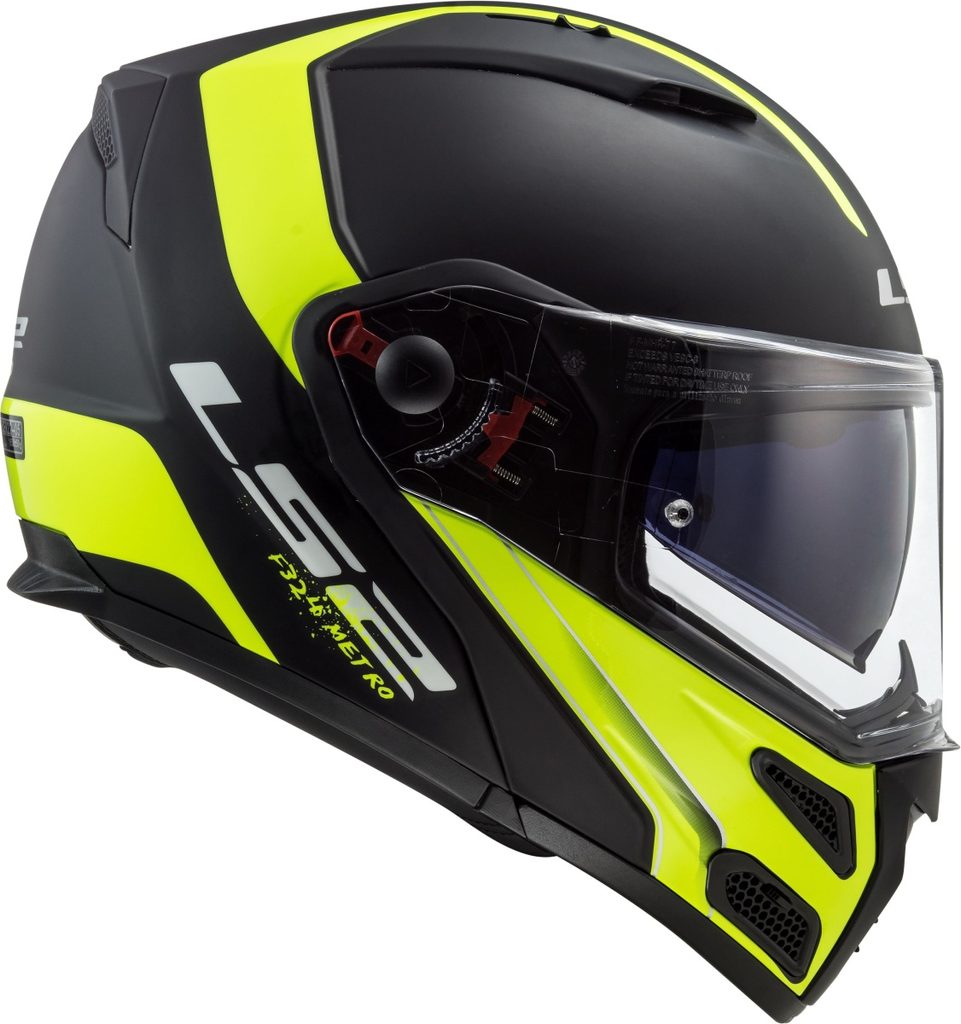 Moderná vyklápacia prilba s integrovanou slnečnou clonou a slnečným štítkom, vysoko odolná škrupina z patentovaného materiálu KPA v atraktívnych a bezpečných svietivo žlto-čiernych farbách, opticky presné plexi s úpravami proti zahmlievaniu / poškriabaniu / Anti-UV, vetranie Dynamic Flow-through Ventilation + prídavné vstupy pre prívod čerstvého vzduchu vpredu, viacdielna výstielka s diferencovanou hustotou EPS, komfortný antibakteriálny antialergický vyberateľný a prateľný interiér, zapínanie rýchlosponou, hmotnosť 1600g