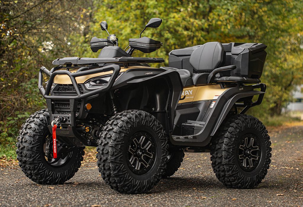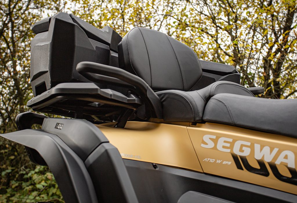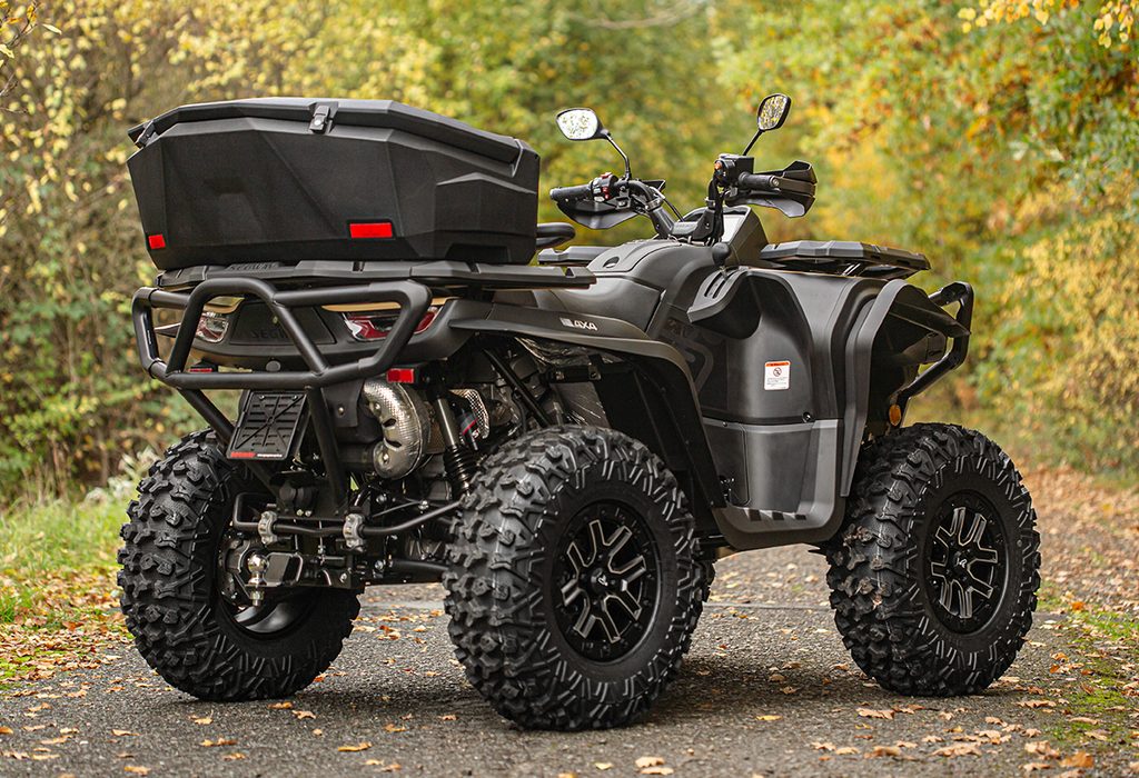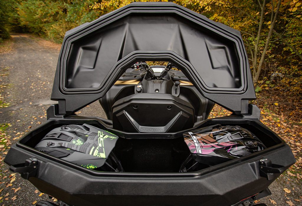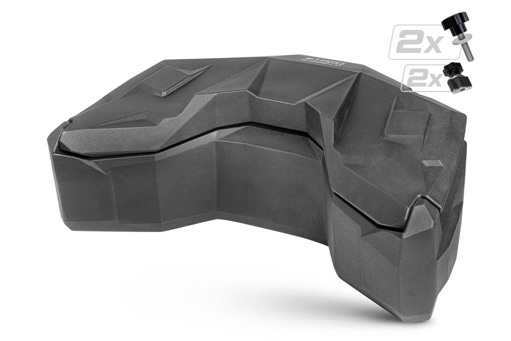 Extra velký uzamykatelný zadní box na čtyřkolku o objemu 145 litrů, těsnění proti vnikání vody, dvě zadní odrazky, zamykání na dvě kovové přezky, rychloupínací sada součástí balení