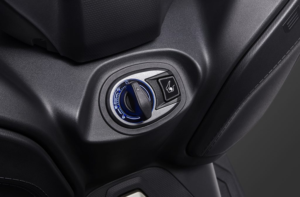 Maxsym 400 má bezkľúčový systém. Kľúč bol nahradený špeciálnym otočným tlačítkom pre aktivovanie zapaľovania.